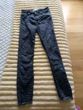 Pantalones vaqueros de Zara con un llamativo estampado. - Diseño de cebra en tonos grises y negros. - Corte ajustado. - Bajo deshilachado. En la etiqueta pone talla 34 pero son una talla 32. Se han usado pero están en buenas condiciones.