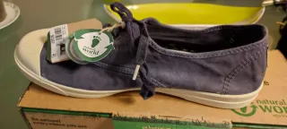Zapatillas de lona de la marca Natural World. - Color azul marino con detalles en beige. - Cierre de cordones. - Suela de goma. Se venden por error de número y no se pueden cambiar.Estan sin estrenar.