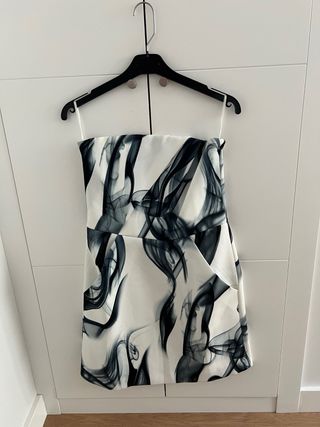 Vestido sin tirantes blanco y negro con un llamativo estampado de humo. - Estructura de ballena interior - Cierre de cremallera oculta en la espalda - Completamente forrado - Bolsillos