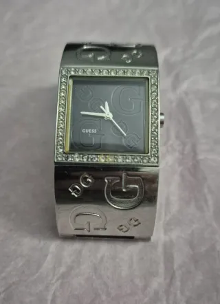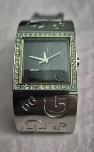 Elegante reloj de pulsera Guess para mujer. - Diseño con incrustaciones de pedrería. - Pulsera ancha con grabado de la G de Guess. - Esfera cuadrada con detalles en relieve.