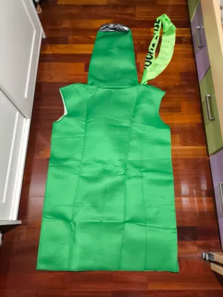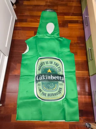Divertido disfraz con forma de botella de cerveza. - Diseño llamativo con etiqueta. - Ideal para fiestas y eventos temáticos.