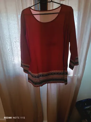 Camisa de manga larga en tono granate con un bonito estampado étnico en los bajos y puños. - Diseño con escote redondo. - Estampado multicolor en contraste.