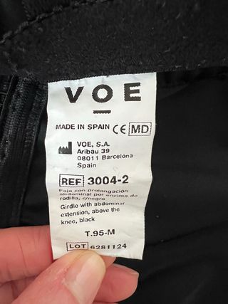 Faja de compresión postoperatoria de la marca VOE, modelo 3004-2. - Fabricada en España. - Con prolongación abdominal por encima de la rodilla. - Color negro. Está diseñada para la recuperación después de cirugías plásticas y estéticas, como la liposucción, ayudando a controlar la inflamación y mejorar la cicatrización. Fabricante: VOE, S.A., con sede en Barcelona, España. Referencia del producto: 3004-2. Talla: T.95-M.