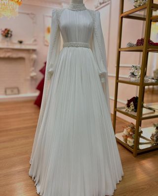 Vestido de novia nuevo a estrenar color ivory, tela gaza Española con pliegues pedreria cola y velo de 4 metros (la cola se puede retirar lleva botones invisibles) es para una persona que pese máximo 60 kilos. Medidas aproximadas 90/75/90 cm altura 1,60 cm. Cuenta con enagua y faja todo nuevo sin uso.