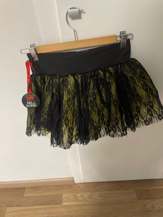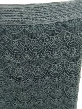 Falda corta con un diseño de encaje. - Cintura elástica negra. - Capa exterior de encaje negro. - Forro interior de color verde oliva.