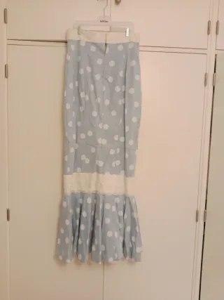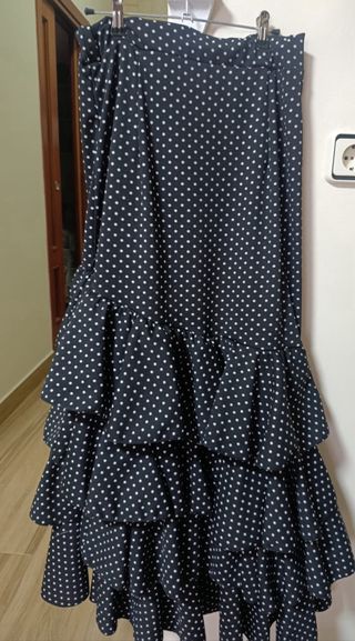 Falda rociera con un diseño de lunares clásico y elegante. Es de licra, el tejido estira, da hasta una talla 44. Perfecta para bailar y lucir en cualquier evento. - Diseño de lunares blancos sobre fondo negro. - Múltiples volantes escalonados en la parte inferior. - Volante adicional en el lateral derecho. -Bolsillo interior - Dos aretas entre volantes para sacarle y aumentar el largo de la falda