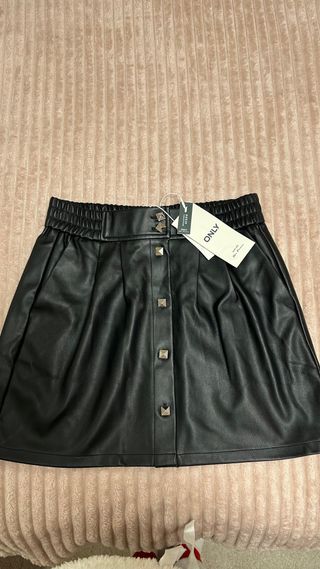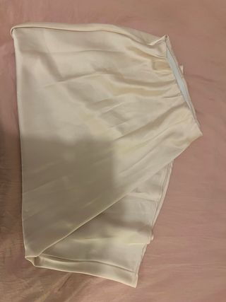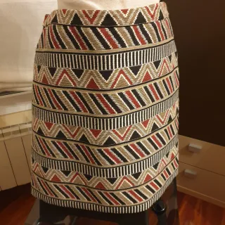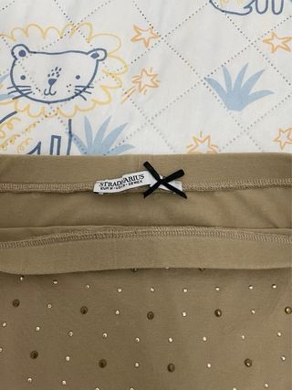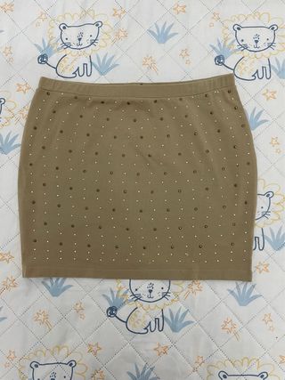 Falda corta de corte recto con un diseño de tachuelas por ambos lados. - Color beige con detalles dorados. - Tejido elástico. Marca Stradivarius Talla M Muy poco uso, en perfecto estado.