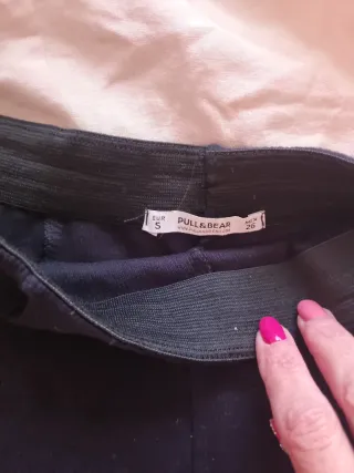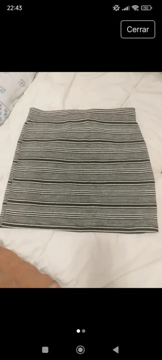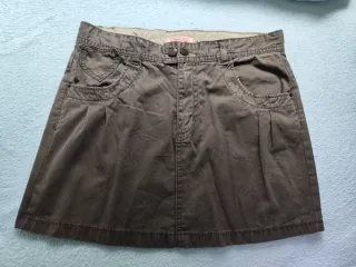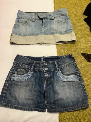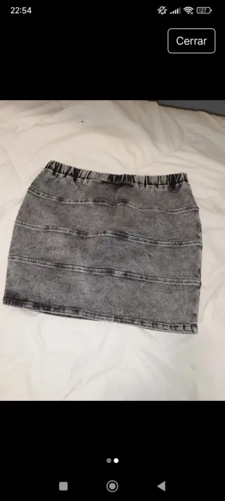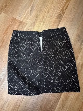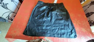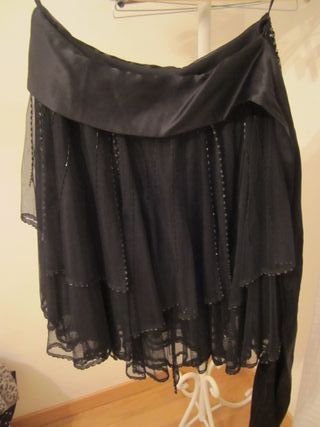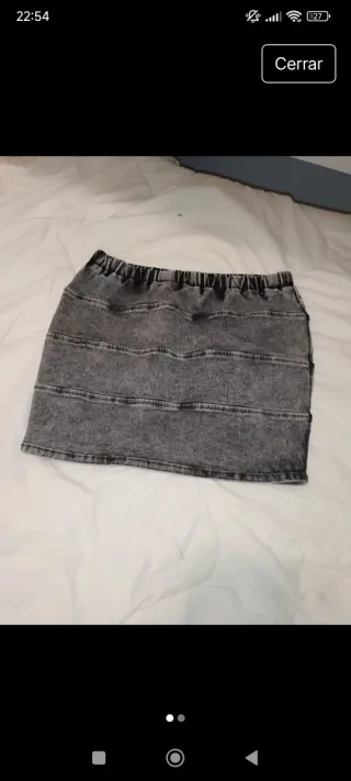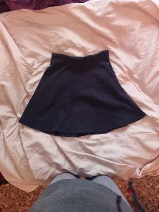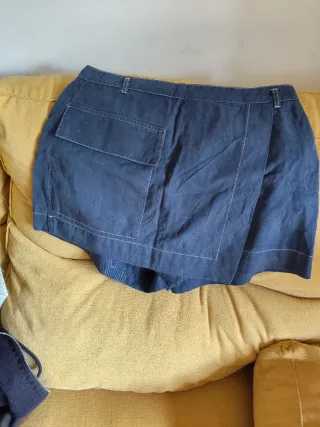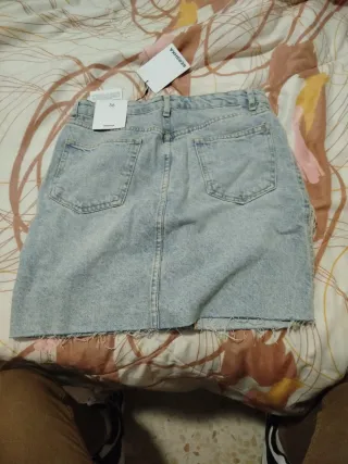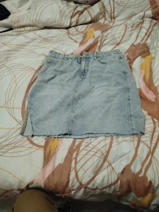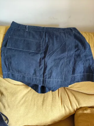 Vendo falda vaquera corta de color negro. Posee dos bolsillos delanteros y dos traseros, tiene cremallera y un botón para abrir y cerrarla. Tiene incorporado un cinturón para ajustar más o menos la falda. Tiene detalles de rotos que venían cuando se compró. Talla 42 de mujer. En buen estado. Muy cómoda y elegante. Las medidas son: - Cintura: 39cm - Cadera: 43cm - Largo de la prenda: 45cm