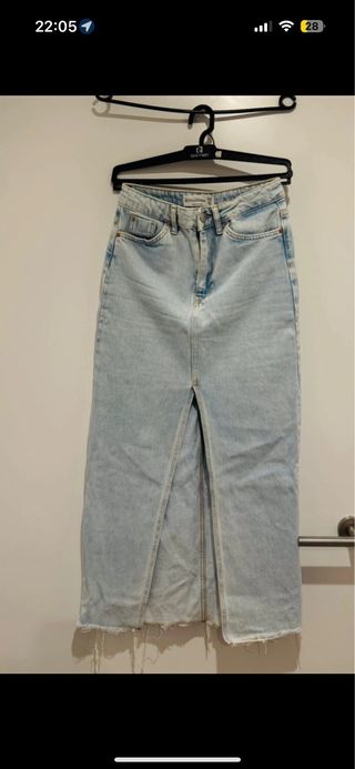 Falda vaquera de corte recto con un estilo moderno y juvenil. Perfecta para combinar con cualquier prenda. - Diseño desgastado. - Bajo deshilachado. - Cintura con trabillas para cinturón.