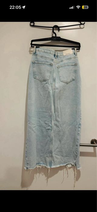 Falda vaquera de largo midi con pespuntes blancos. - Diseño de corte recto. - Bolsillo de parche en el lateral. - Cintura con trabillas para cinturón.