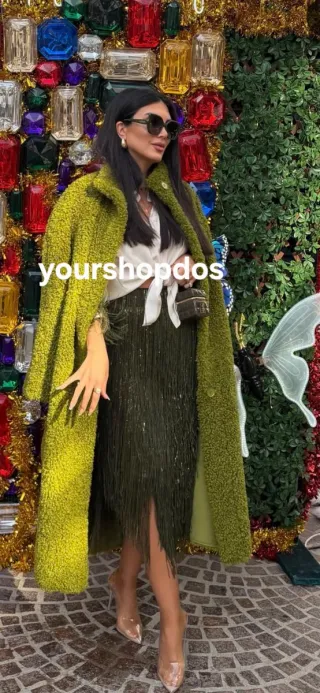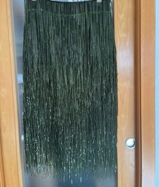 Falda de Zara con un diseño de flecos muy llamativo. - Color verde oliva. - Largo midi. - Abertura lateral.
