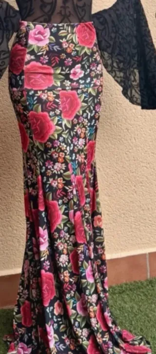 Falda con un bonito estampado floral y volantes. - Diseño con volantes. - Estampado multicolor sobre fondo negro.
