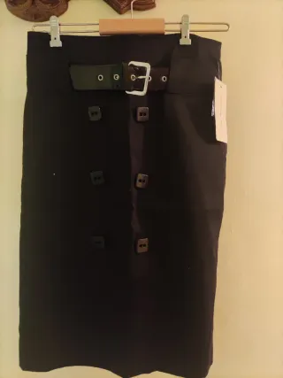 Falda de estilo moderno con detalles llamativos. - Cinturón negro con hebilla plateada. - Cierre de botones cuadrados. - Diseño de corte recto.