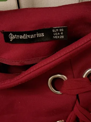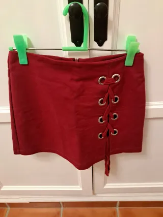 Falda pantalón de color burdeos con un diseño moderno. - Detalle de cordones en un lateral. - Ojales metálicos. - Cremallera en la parte trasera.