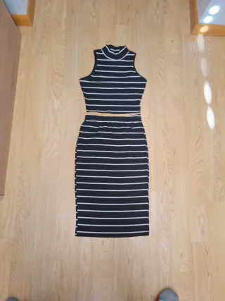 Conjunto de dos piezas con estampado de rayas horizontales. - Top de cuello alto sin mangas. - Falda de tubo a juego.