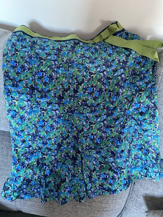 Falda con un bonito estampado de pequeñas flores en tonos azules y verdes. El diseño es alegre y vibrante. - Cintura con detalle de cinta verde. - Bajo con volante. - Tejido ligero y fluido.