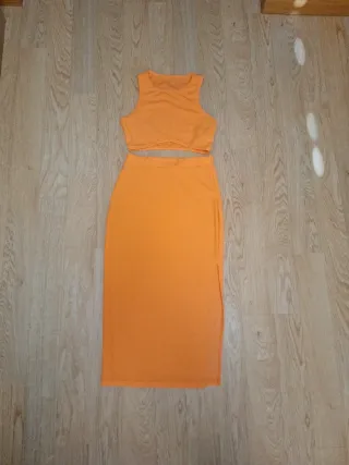 Conjunto de dos piezas en color naranja, compuesto por un top y una falda larga. - Top de tirantes. - Falda larga con abertura lateral.