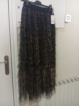 Falda larga con un diseño de volantes y estampado animal print. Es una prenda sin estrenar. Tiene forro por arriba de la rodilla - Diseño de volantes en cascada. - Estampado animal print. - Cintura elástica.