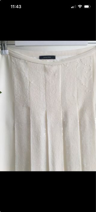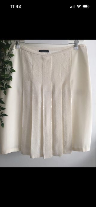 Elegante falda de seda con un diseño de pliegues y detalles brillantes. - Material: Seda - Color: Beige y blanco - Diseño: Pliegues frontales con lentejuelas sutiles - Forrada - Cremallera lateral - Contorno de cintura 90 cm - Largo 58 cm