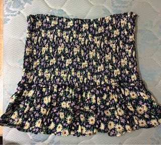 Falda corta con estampado floral y cintura elástica. - Diseño fruncido, medida del elástico 24cm. - Volante en el bajo, medida 16cm. -Largo de la falda 40cm.