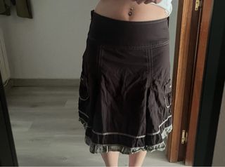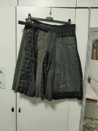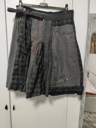 Falda acampanada con un diseño patchwork único.tela gordita de abrigo En perfecto estado - Combinación de diferentes tejidos y texturas.queda chula,sirve para 42,44 - Detalle de cremallera lateral. - Cinturón de tela a juego. - Adorno de volantes en el bajo. - Parche decorativo con texto 'STILL WANTED'.hago envios