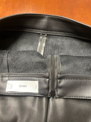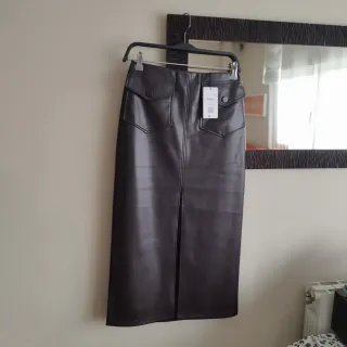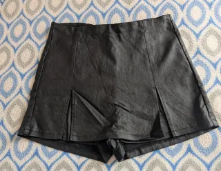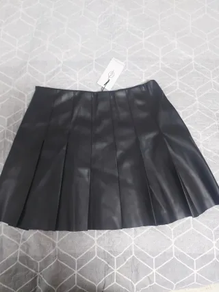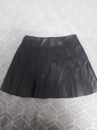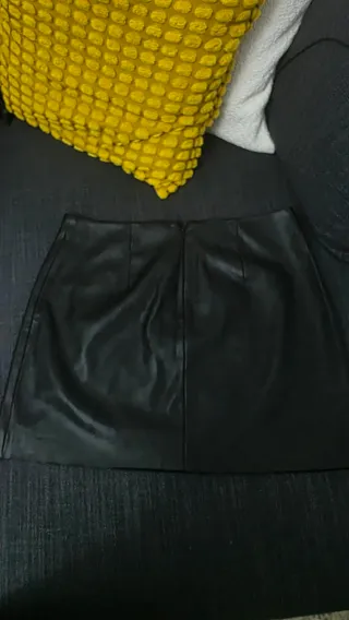 Falda negra estilo cuero talla L. De Stradivarius. Se abre entera con la cremallera. Está Nueva, puesta una sola vez. Hago envíos por wallapop.