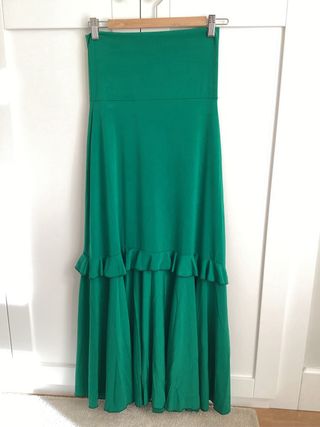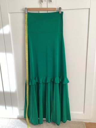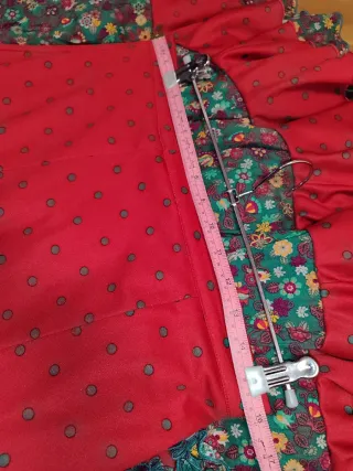 Falda flamenca. Color rojo y verde. Talla 42/44. Medidas 81cm cintura, 100cm cadera, 110cm largo. En muy buen estado. No tiene marca, la etiqueta está cortada. - Diseño de lunares verdes. - Volantes con estampado floral. - Detalle de volantes en cascada en el bajo.