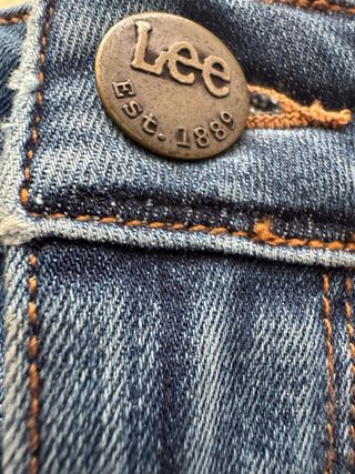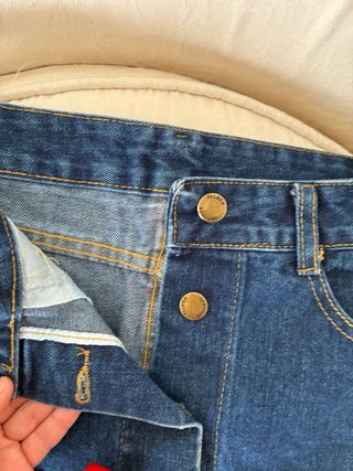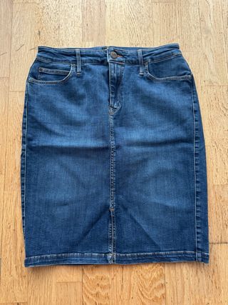 Falda tejana de corte recto. - Diseño clásico. - Cierre de cremallera y botón. - Bolsillos delanteros.