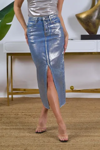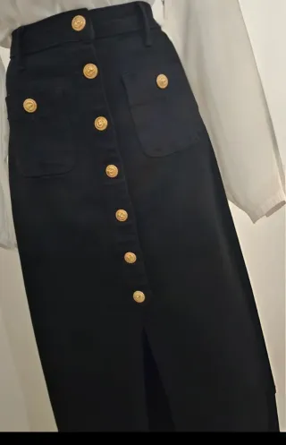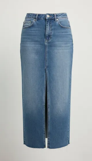 Falda vaquera de corte recto y largo hasta la rodilla. Perfecta para un look casual pero con un toque chic. - Estilo: Falda vaquera midi - Detalle: Impactante abertura central en la parte delantera - Tejido: Denim resistente y de buena calidad. - Bolsillos: Cinco bolsillos clásicos (tres delanteros, dos traseros). - Cierre: Cremallera y botón metálico.