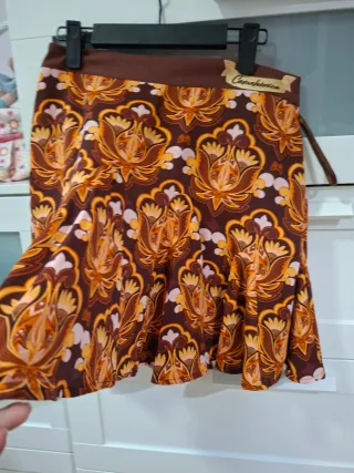 Falda corta con un estampado floral vibrante y alegre. Estampado de flores y hojas en tonos marrones, rosas, beige y turquesa. Talla pequeño, pone que es una M, pero diría que es una S.
