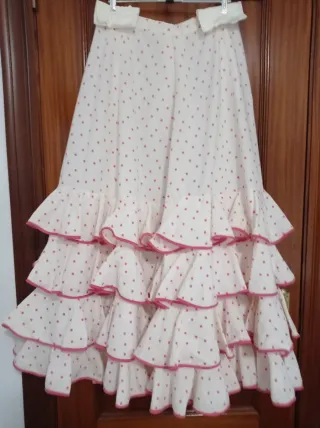 Falda de sevillanas con volantes, usada una sola vez. Talla S/M.Regalo pañoleta blanca. - Diseño de lunares. - Precio: 40€. - Zona de entrega: Diego de León.