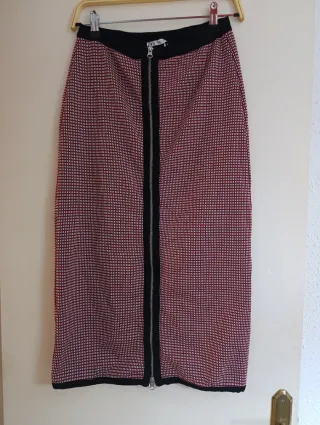 Falda midi de corte recto y elegante. - Largo hasta la rodilla. - Abertura frontal. - Cierre de cremallera.