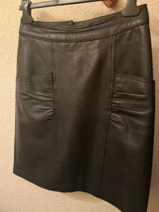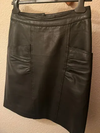 Falda de cuero auténtico en color negro forrada.Diseño moderno con bolsillos. -Medidas: 55 largo, 39cintura. - Material: Piel - Color: Negro - Diseño con bolsillos delanteros - Costuras detalladas - Vendo también una cazadora de piel negra.