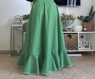 Falda larga de estilo flamenco con un alegre estampado de lunares blancos sobre fondo verde. El diseño es amplio y con vuelo, ideal para bailar, - Estampado de lunares blancos. - Diseño amplio y con vuelo. - Bajo con volante.
