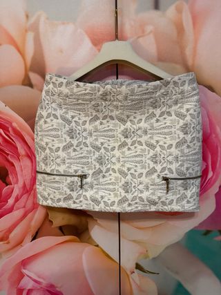 Falda de Pull&Bear con un diseño estampado.Largo-34cm - Estampado de hojas y ramas en tonos grises y blancos. - Detalle de cremalleras decorativas en la parte inferior.