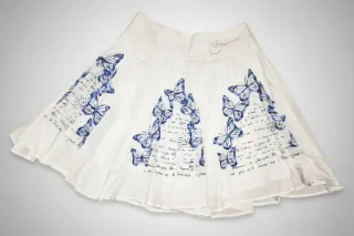 Falda blanca con un estampado precioso de mariposas y mensajes en azul. - Estilo: Acampanada, muy vaporosa y con movimiento. - Tejido: Ligero. - Ajuste: Cremallera discreta en el lateral para una fácil puesta. - Detalle Clave: Incluye forro interior para asegurar que no se transparente.