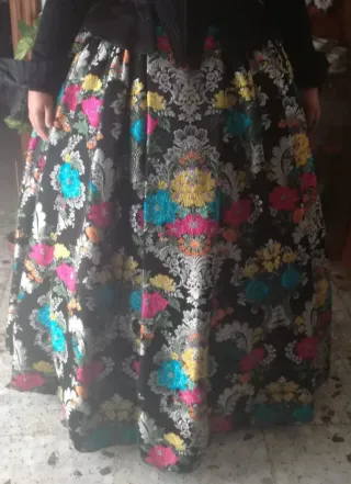 Falda tradicional de Alicantina o Fallera con un diseño llamativo. - Tejido con estampado floral y damasco. - Base negra con detalles en tonos vibrantes.