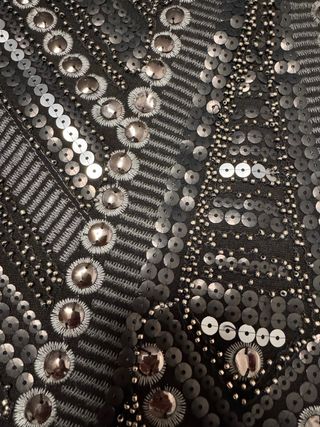 Falda corta con un diseño llamativo de pedrería y lentejuelas. - Diseño geométrico con detalles plateados. - Acabado brillante.