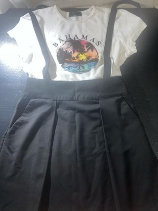 Conjunto de falda negra y camiseta blanca con estampado de berskha - Camiseta con diseño Bahamas y palmeras. - Falda con tirantes incorporados. - Diseño moderno y juvenil.