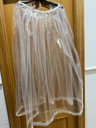 Protector para falda de fallera, ideal para mantenerla en perfecto estado. Con un delicado detalle de puntilla en el bajo. se hace a tu medida - Material transparente. - Diseño con pliegues. - Detalle de puntilla en el borde inferior.