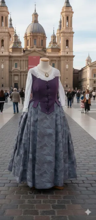 Traje tradicional baturra, ideal para fiestas y eventos. - Cuerpo de corpiño morado con cordones. - - Falda larga en tonos Pico todo confección propia.