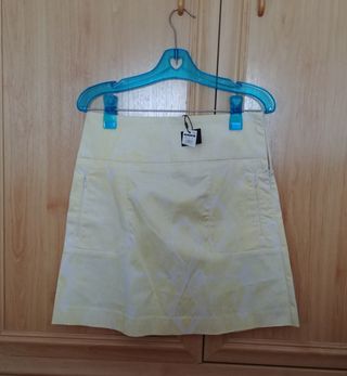 Con etiqueta, de Cortefiel, perfecta también para regalar, Minifalda con un bonito estampado. Talla S, talla 36. - Color base blanco con estampado en amarillo. - Diseño de corte recto. - Cremallera lateral.