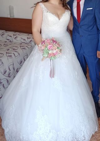 Vendo vestido de novia Modelo INA Talla 42/44 Color blanco Altura como para 1.70cm Vestido corte princesa, con escote en V y tirante calado. El corpiño tiene fruncido lateral y pedrería. La falda tiene 3 capas con una última de tul con brillo y puntilla en la parte de abajo. La espalda es abotonada con corte en V. El vestido está perfecto, tan solo tiene un poco de roce en el dobladillo de la zona interna de la falda. Si tienes dudas o necesitas medirlo o incluso verlo, hablame sin problema. No hago envíos, sólo entrego en mano Zona Salamanca y alrededores. Precio negociable