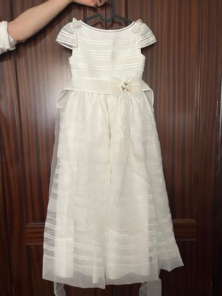 Vestido de comunión elegante, ideal para una ocasión especial. En una imagen se ve un poco roto, pero se puede arreglar perfectamente. Por lo demás esta genial - Diseño con detalles de encaje y pedrería. - Fajín con adorno floral. - Falda vaporosa con varias capas de tul.