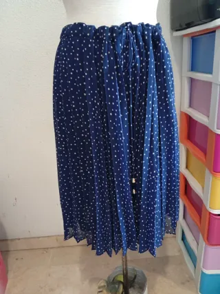 Falda plisada con un bonito estampado de lunares blancos sobre fondo azul. Es una prenda versátil y cómoda. - Diseño plisado. - Cintura elástica con cordón ajustable. - Bajo con detalle de volantes.