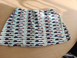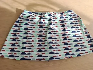 Falda estampada con un diseño divertido y original. - Cintura elástica para mayor comodidad. - Estampado de semicírculos en tonos azul marino, burdeos y verde menta sobre fondo blanco. - Logo de la marca en la parte inferior. - Ideal para la práctica de pádel o para un look casual.