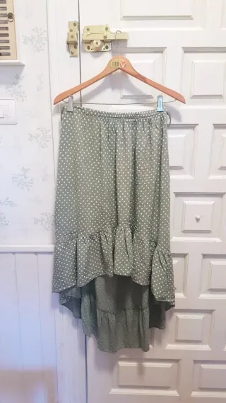 Falda de verano muy fresca, con un diseño de vuelo y estampado de lunares blancos sobre fondo verde. - Estampado de lunares blancos. - Diseño con vuelo. - Tejido ligero y fresco. - cintura elástica 33 cm, largo 50.