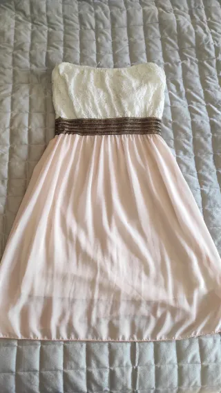 Vestido fluido sin tirantes con un diseño elegante y forro para que no transparente 🤩 - Parte superior de encaje blanco. - Cinturón decorativo. - Falda vaporosa en tono rosa pálido. No tiene tirantes, pero lleva unas espumillas en el pecho😁 Parte de la cintura color dorado/marrón brillante y parte de pecho blanco🤩 Talla S🏷️ Ideal para ocasiones especiales🤗 queda monísimo!🥰 Del tiempo, la parte del corpiño tiene algunos hilitos elásticos, pero en general está super bien 👌🏻