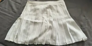 Falda blanca con un diseño moderno y cómodo. - Tejido texturizado. - Cintura elástica. - Corte acampanado. Tienen una pequeña mancha rosa de ambientador que apenas se aprecia. Pack 10€
