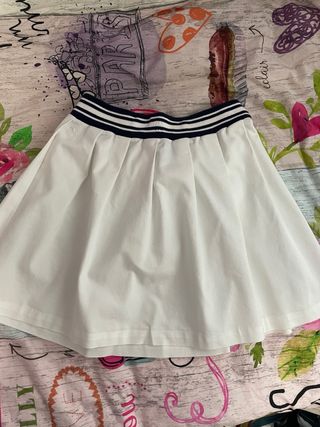 Falda corta plisada de estilo Y2K. - Diseño con doble raya blanca en el bajo. - Cintura elástica. - Tejido cómodo y ligero. - 37cm de largo.
